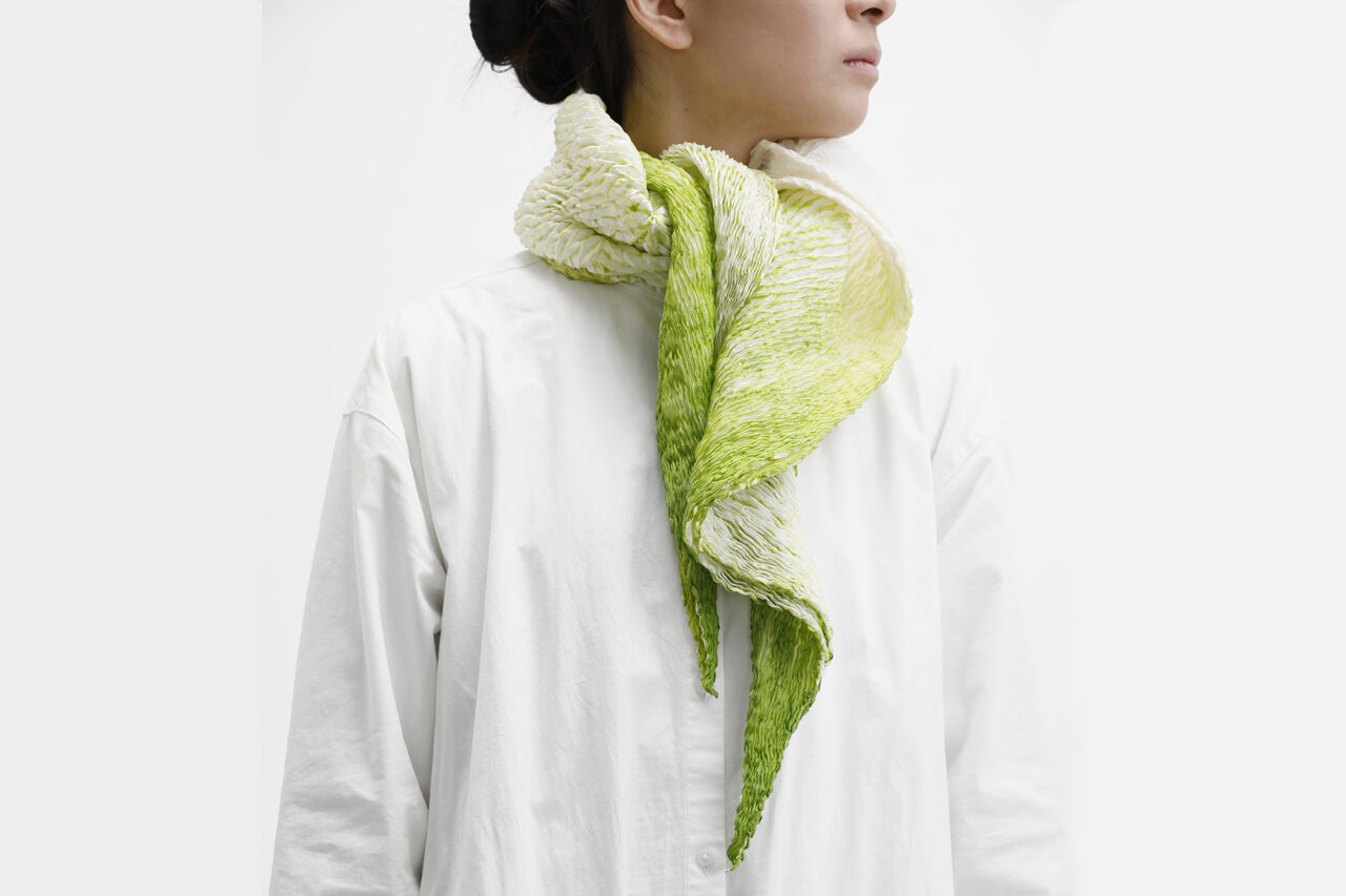 摘んだ生地を先まで巻き上げる手法で、つんつんと尖ったフォルムが個性的なストールです。