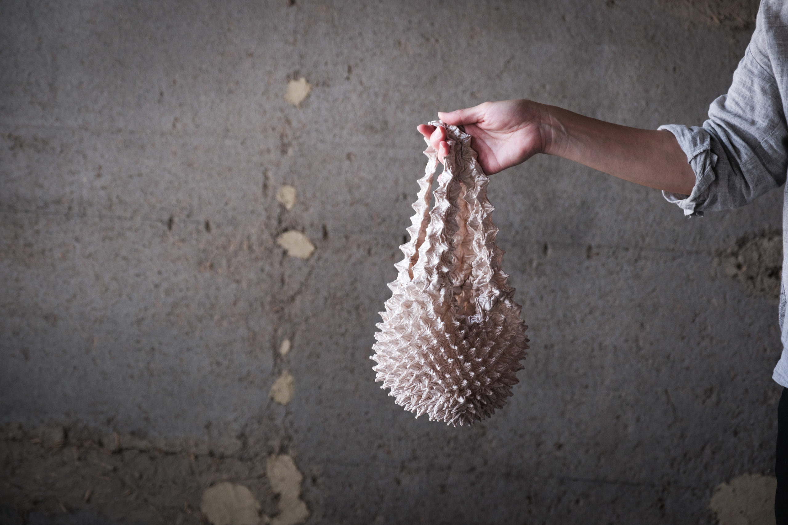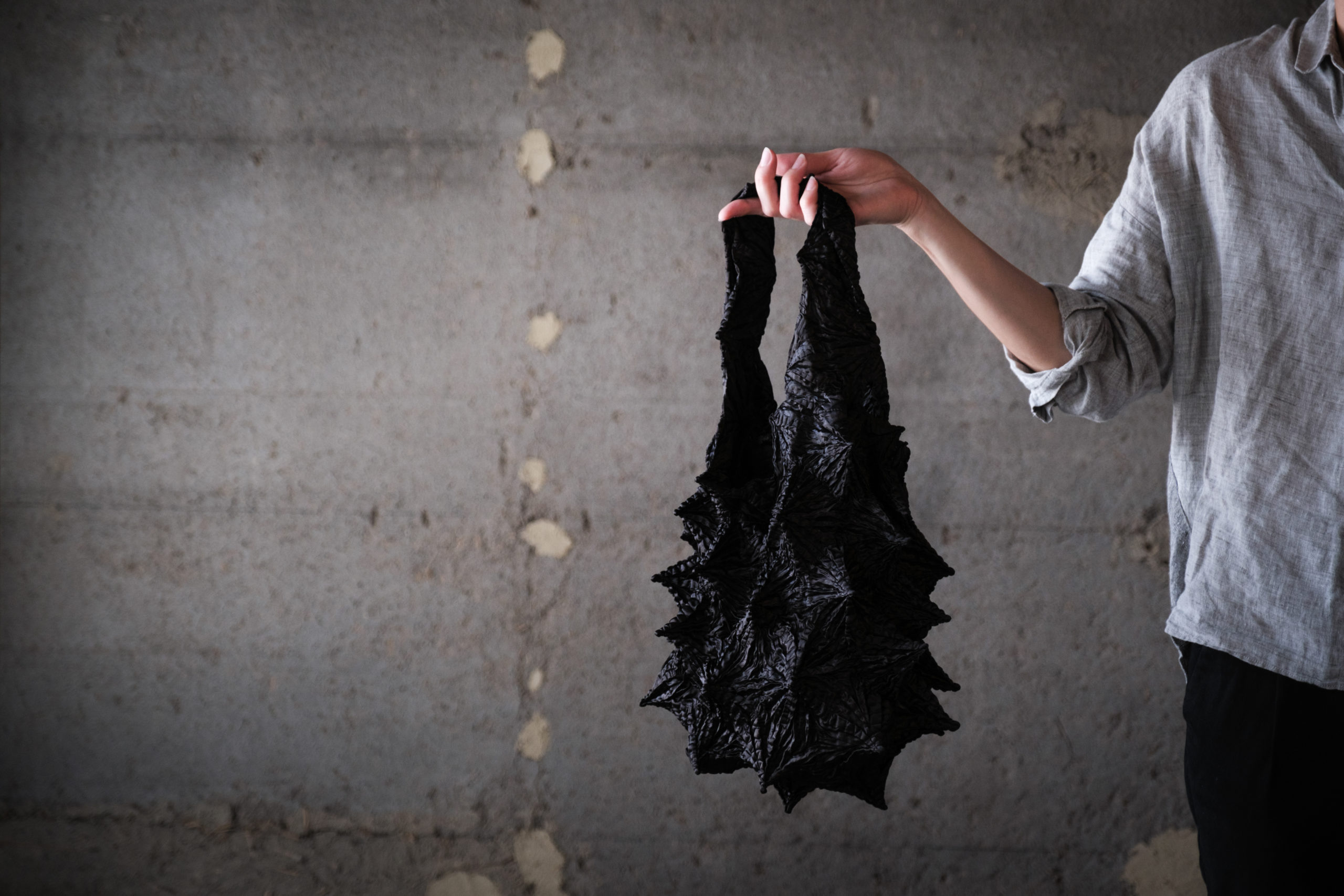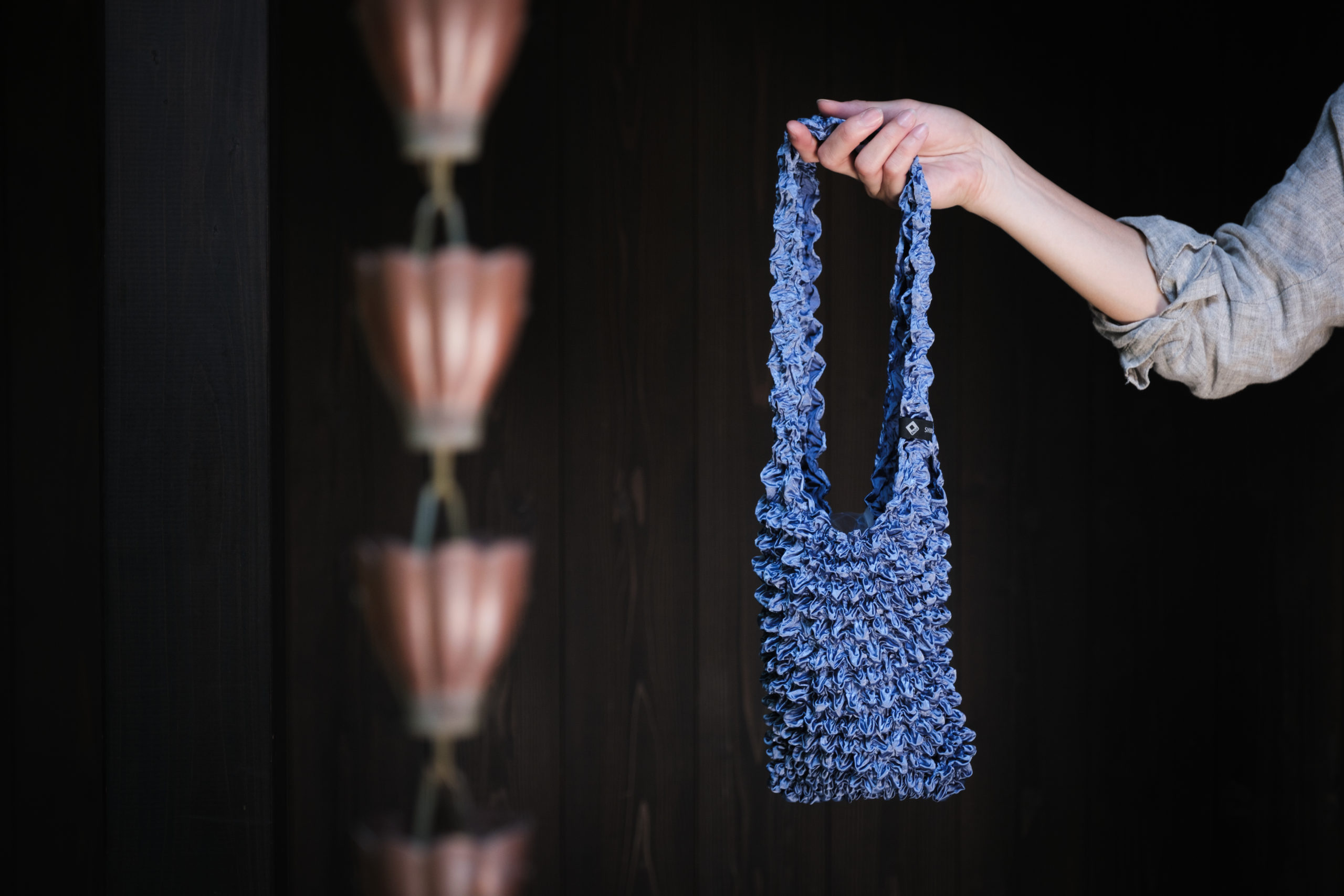 絞加工の伸縮性を利用し、使わないときは小さく、荷物を入れると以外に伸びるバッグ。
