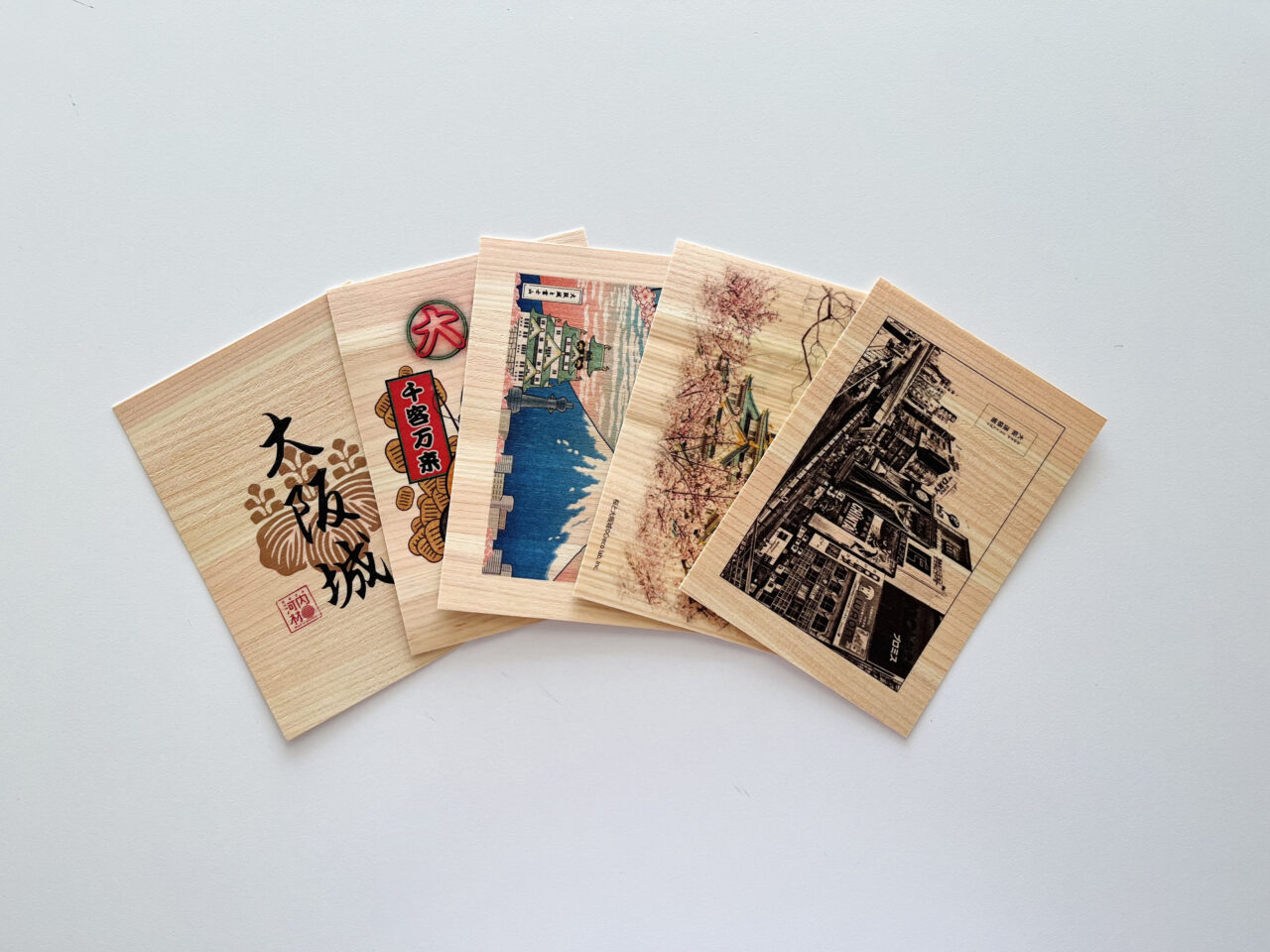 京都市の木(みやこ杣木)などを使った木の絵葉書、京都の観光名所の絵柄や、海外の観光客に人気の浮世絵など、ターゲットニーズに合わせて小ロットで提供可能です。(写真はおおさかの万博などでも販売しているおおさか河内材の木の絵葉書です。)