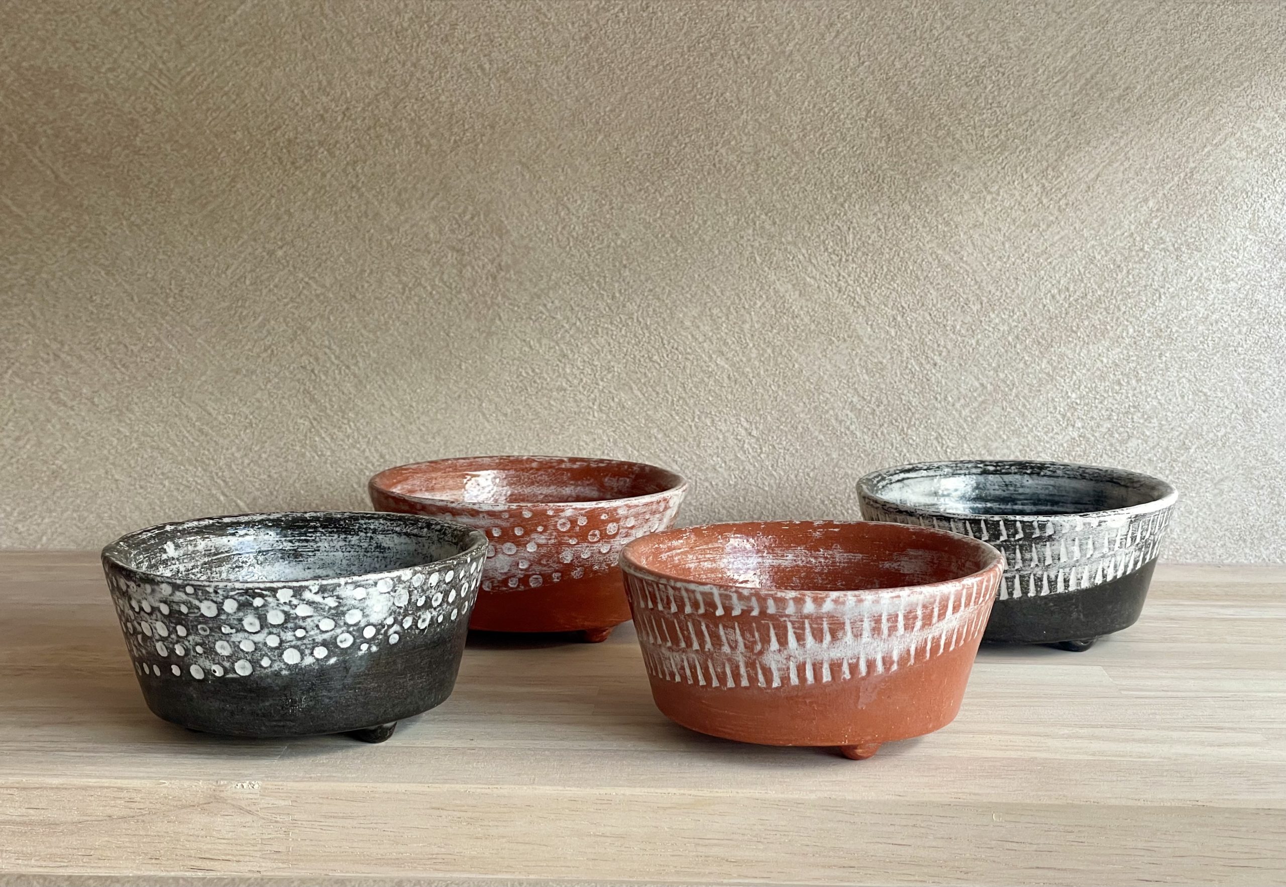 楽焼の窯元「醍醐窯」ならではの伝統の技を活かし、現代的な形を取り入れてAKAtoKUROは誕生しました。楽焼独特の「赤」の色合いは食卓を華やかに彩り、「黒」は食材を引き立てます。また繊細でプリミティブな柄を刻印と白化粧で仕上げた表情は、一つとして同じものがない手作りならではの表現です。上代4,180円/個(税込)