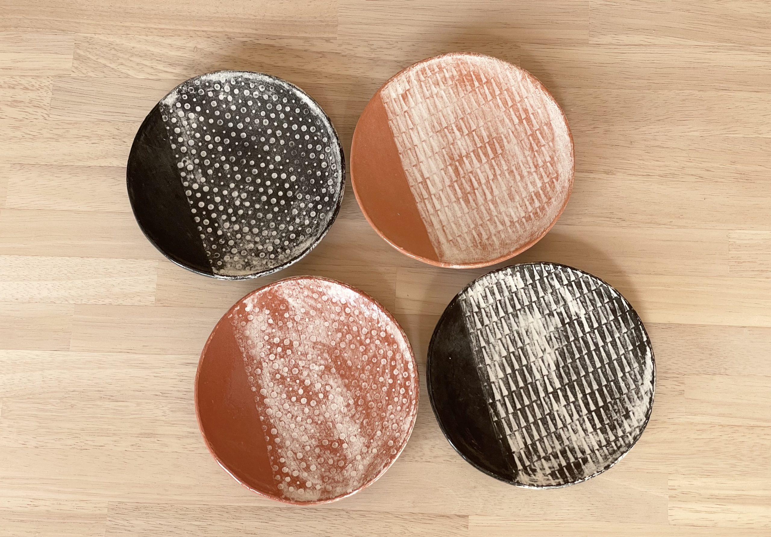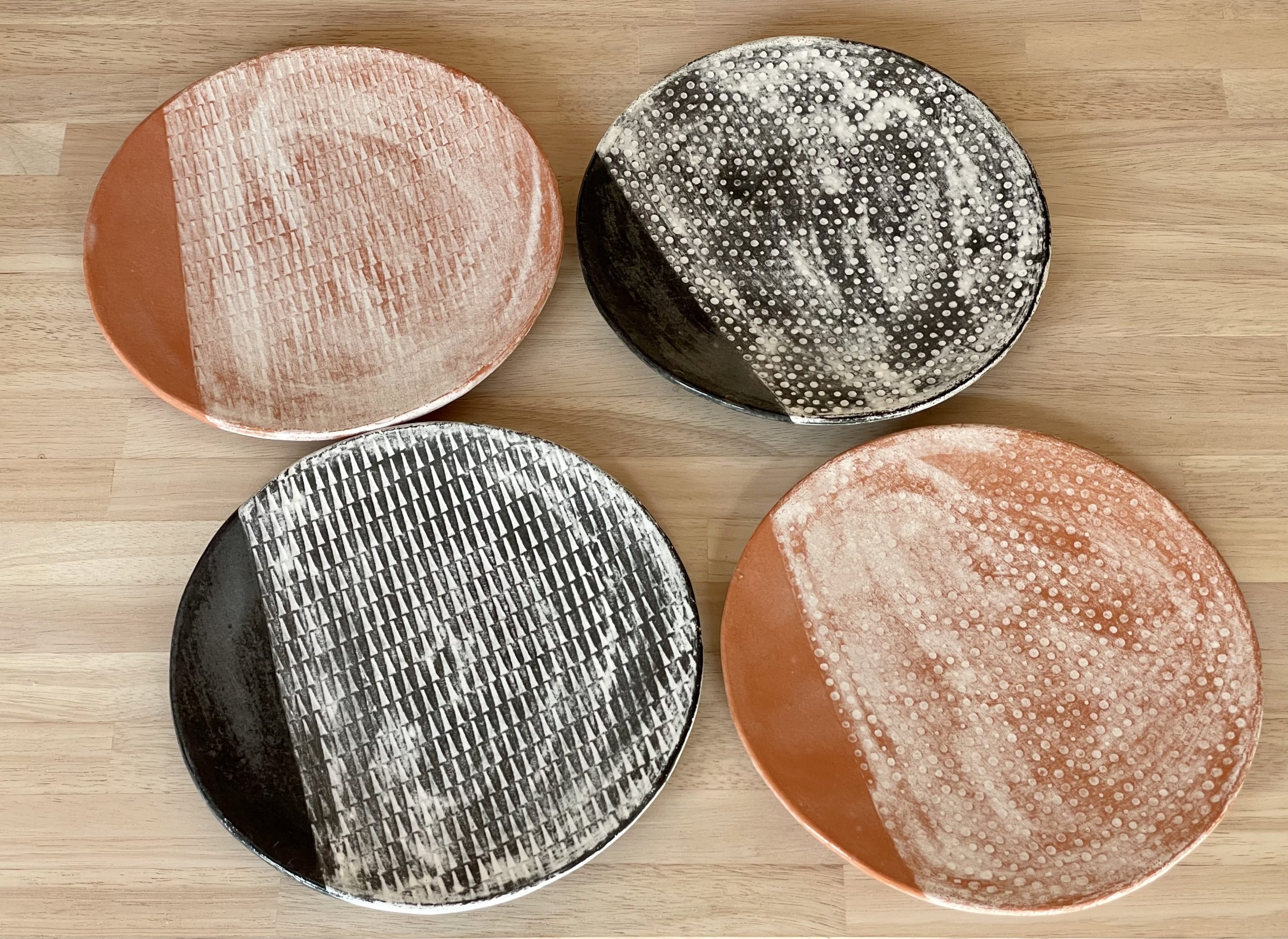 PLATE(L)は使い勝手の良いサイズ感でパスタやステーキなどメインの料理にピッタリです。楽焼の窯元「醍醐窯」ならではの伝統の技を活かし、現代的な形を取り入れてAKAtoKUROは誕生しました。楽焼独特の「赤」の色合いは食卓を華やかに彩り、「黒」は食材を引き立てます。また繊細でプリミティブな柄を刻印と白化粧で仕上げた表情は、一つとして同じものがない手作りならではの表現です。