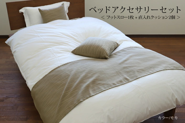 ベッドルームを引き立てるアクセントとして、掛布団の足元に掛けるだけで高級感を演出してくれるフットスローとクッションのセットです。ご注文いただいてから、1枚1枚職人が手作業で丁寧に縫製いたしますので、オリジナルの生地やサイズでお作りすることも可能で、小ロットにも対応しております。