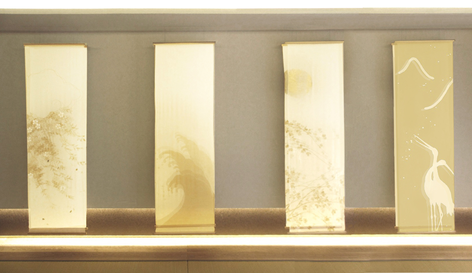北山杉間伐材から完全循環システムで生産した染料で染め上げた絹織物を、オートクチュールのドレスからインスピレーションを得て襲ることで立体感のある軸に仕上げました。京都の伝統技術である職人による手捺染と、デザイナー自身による手描き及び手張り箔で絵柄を表現。軸木は北山杉を使用。絵柄は別途ご要望に応じて制作します(別料金)。納入価格(税抜)800,000円
