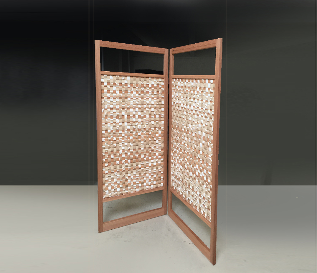 北山杉間伐材から完全循環システムで生産した染料で染め上げた絹織物と、北山杉の板を網代に編み、屏風に仕上げました。「さざなみ」柄と「無地染」で両面、違った雰囲気を楽しめます。染色は京都の伝統技術である職人による手捺染で行います。二曲二双、四曲一双などの対応可能。絵柄は別途ご要望に応じて制作します(別料金)。納入価格(税抜)600,000円