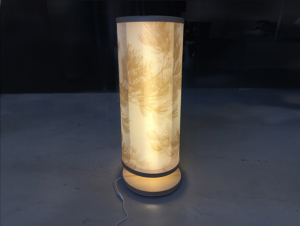 北山杉間伐材から完全循環システムで生産した染料で染め上げた絹織物を、オートクチュールのドレスからインスピレーションを得て襲ることで立体感のある行灯に仕上げました。京都の伝統技術である職人による手捺染と、デザイナー自身による手描き及び手張り箔で絵柄を表現。天板と台座には北山杉を使用。絵柄は別途ご要望に応じて制作します(別料金)。納入価格(税抜)250,000円