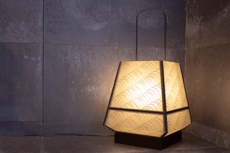 着物の上から羽織る和装コートの薄絹をシェードに使った行灯です。薄絹にほどこされた刺繍紋様「遠波」がやわらかい光を通して浮かびあがります。フレームは鉄製で和モダンな印象です。シェードはPVCラミネートの「絹障子」ですので、お手入れも簡単。電源コネクターは、国内対応プラグのほか、USB対応へのカスタマイズも可能。海外でもご使用頂けます。