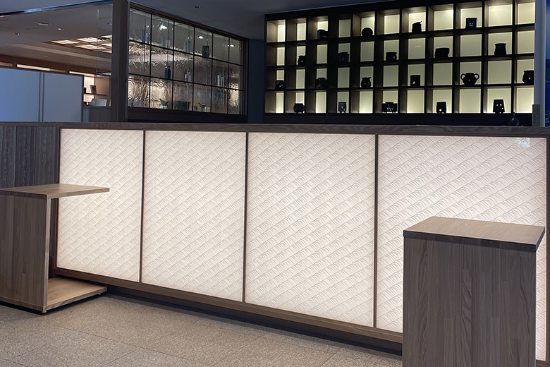 創業から93年、長年和装で培った匠の技と和の美の感性を生かし、身にまとう着物から空間を装わせる内装資材を展開しています。ここでは、着物の上から羽織る薄絹を裏打ちした絹シートに、カバーガラス工法でご採用頂いた、LED内照式の光壁カウンターです。京都丹後の名門旅館「文珠莊」様のリノベーションに際し、絹シートとして資材提供させて頂きました。