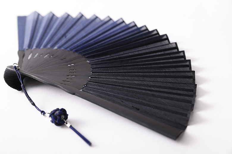 着物生地の老舗「伊と幸」では、ほぼ30年近く、国内養蚕農家と契約し「松岡姫」というお蚕様の繭生産を行っています。本製品の扇面には、緯糸に「松岡姫」の手引糸を使った絹織物を使っています。藍色の濃淡は、着物と同じ「引き染め」の手染めでぼかし染めしています。扇骨も本竹製の天然素材で、お香を入れた水引のチャームが付いています。男女兼用でお使い頂けます。