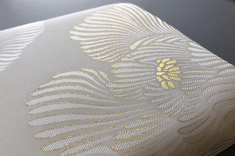 和装文化で培った日本の匠の技と感性を、現代空間に生かすインテリア資材やアートワークに力を入れています。ここでは、牡丹の花弁を線で表現した白生地の地紋様を金彩技法の筒描きで彩り、やわらかい膨らみのある布団貼りのパネルに仕上げています。 設置方法により裏面はドッコ掛け仕様などご相談の上、対応可能です。