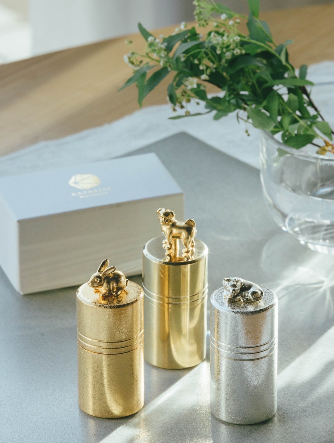 ケースの上には彫金を施した動物や虫がのっており、金属のシンプルさがありながらもどこか可愛らしさがある商品になっております。