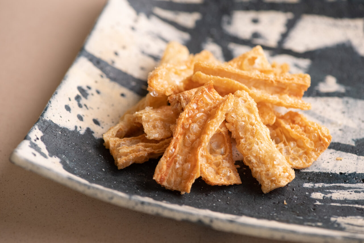湯葉をすくいあげるときに使う竹串に巻き付いた湯葉をはがして油で揚げたもの。湯葉が何層にも重なったサクサクとした食感が特徴。湯葉の凝縮された旨味と食感がやみつきになり、おかわりする方も。