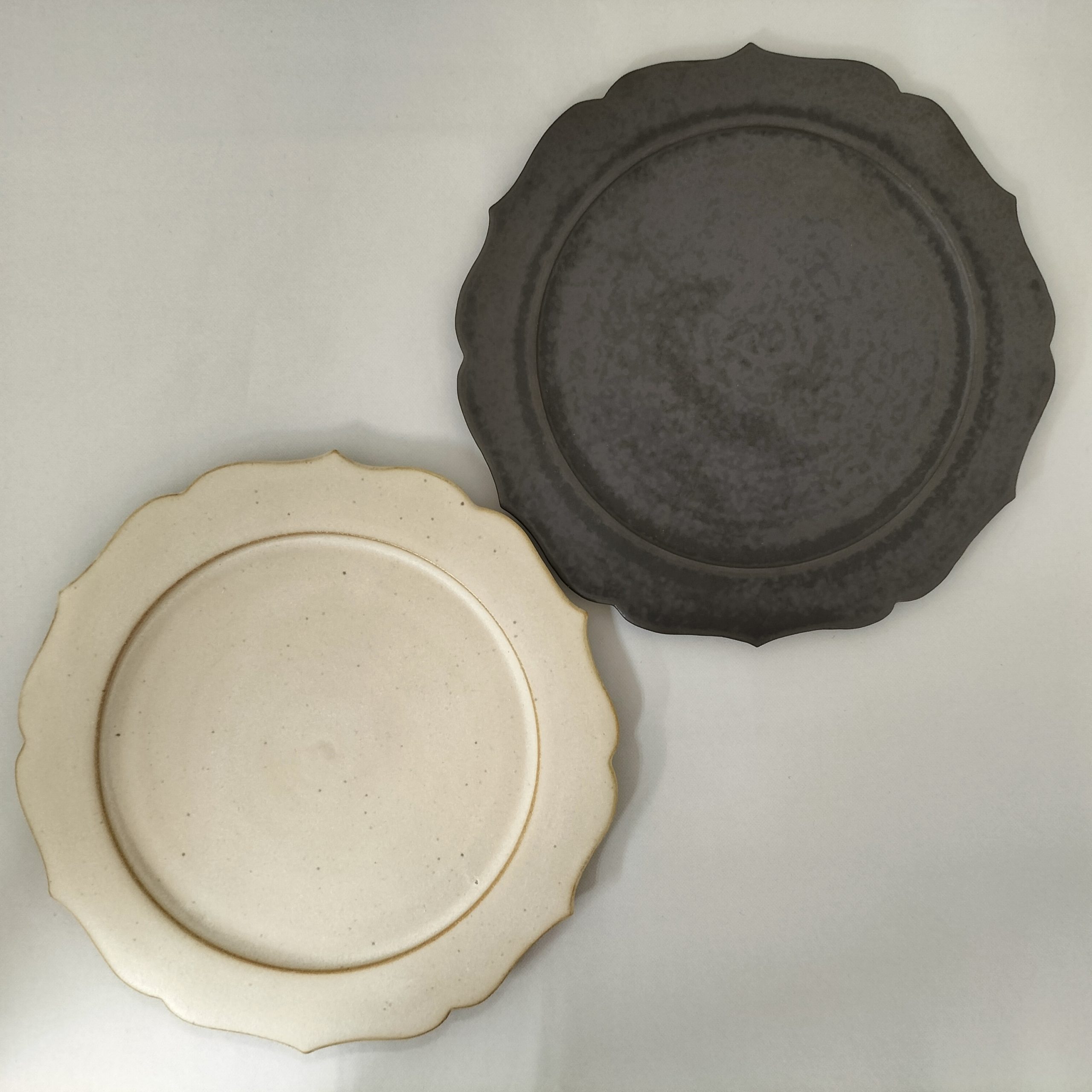 縁を花の形の様に削った一枚で華やかなリムプレート。 色違い、形違い、大きさ違いなど様々に組み合わせてもお楽しみいただけます。 お菓子からおかずまで何にを盛り付けてもおしゃれな食卓になること間違いないです。