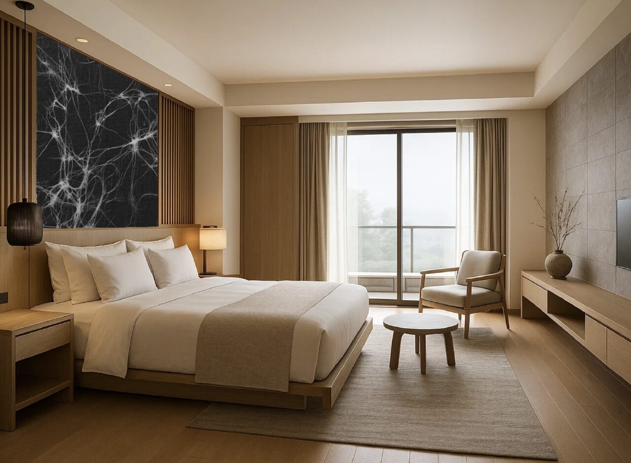 天然繊維を活かした染色壁紙は、唯一無二のテクスチャーと深みのある色合いが特徴。自然素材ならではの温かさに加え、ろうけつ染め独特のひび割れ模様が空間に奥行きを与えます。ホテルやレジデンスなどのラグジュアリーインテリアから、個人邸宅のアクセントウォールまで幅広く採用可能。不燃、防火性能にも対応しており、公共空間にも安心してお使いいただけます。(カタログあり。参考価格:¥13,000/m〜、生地、デザイン、注文数によって異なります。)