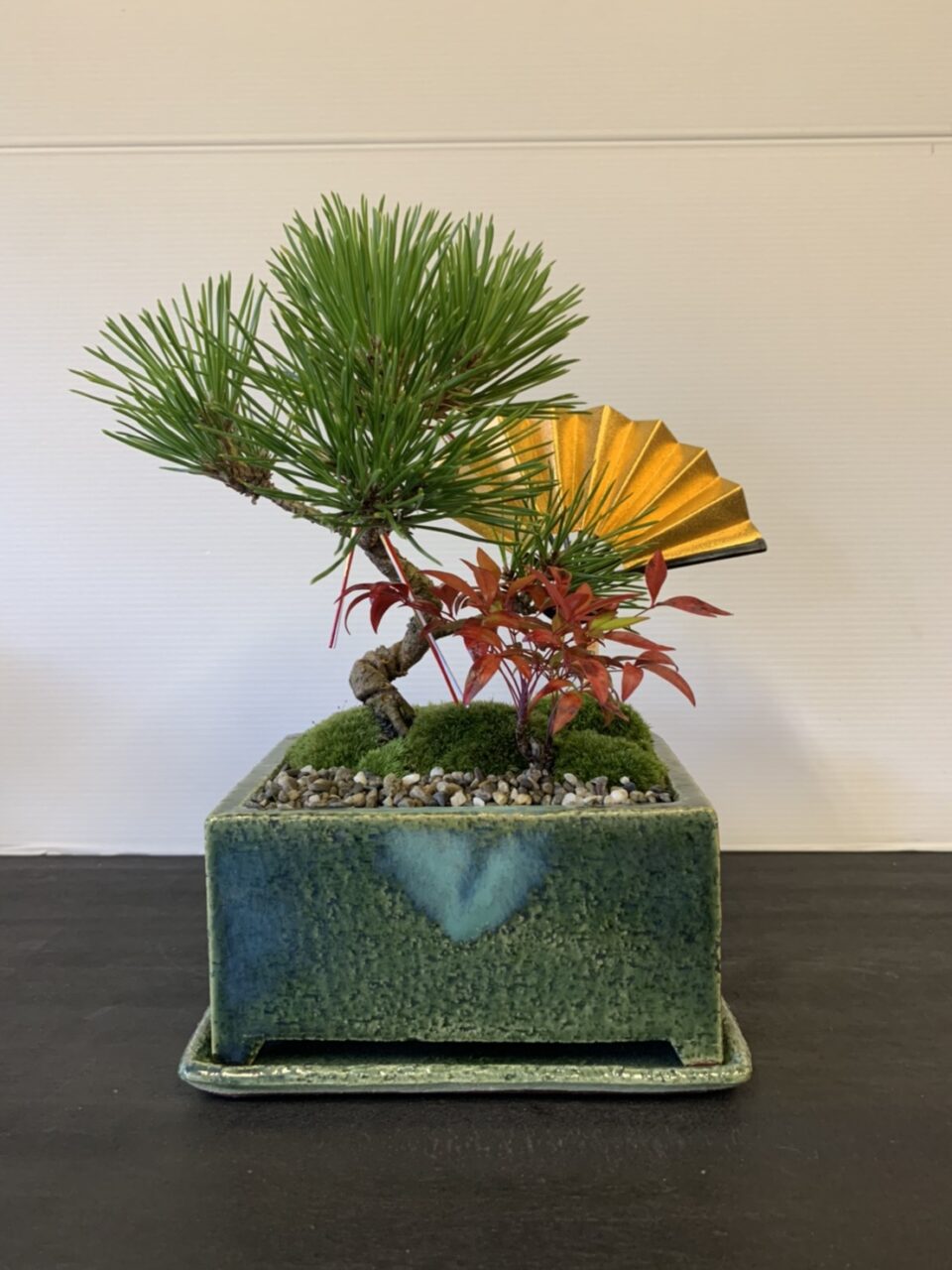 長角鉢 織部焼 黒松・五色南天 寄植え
