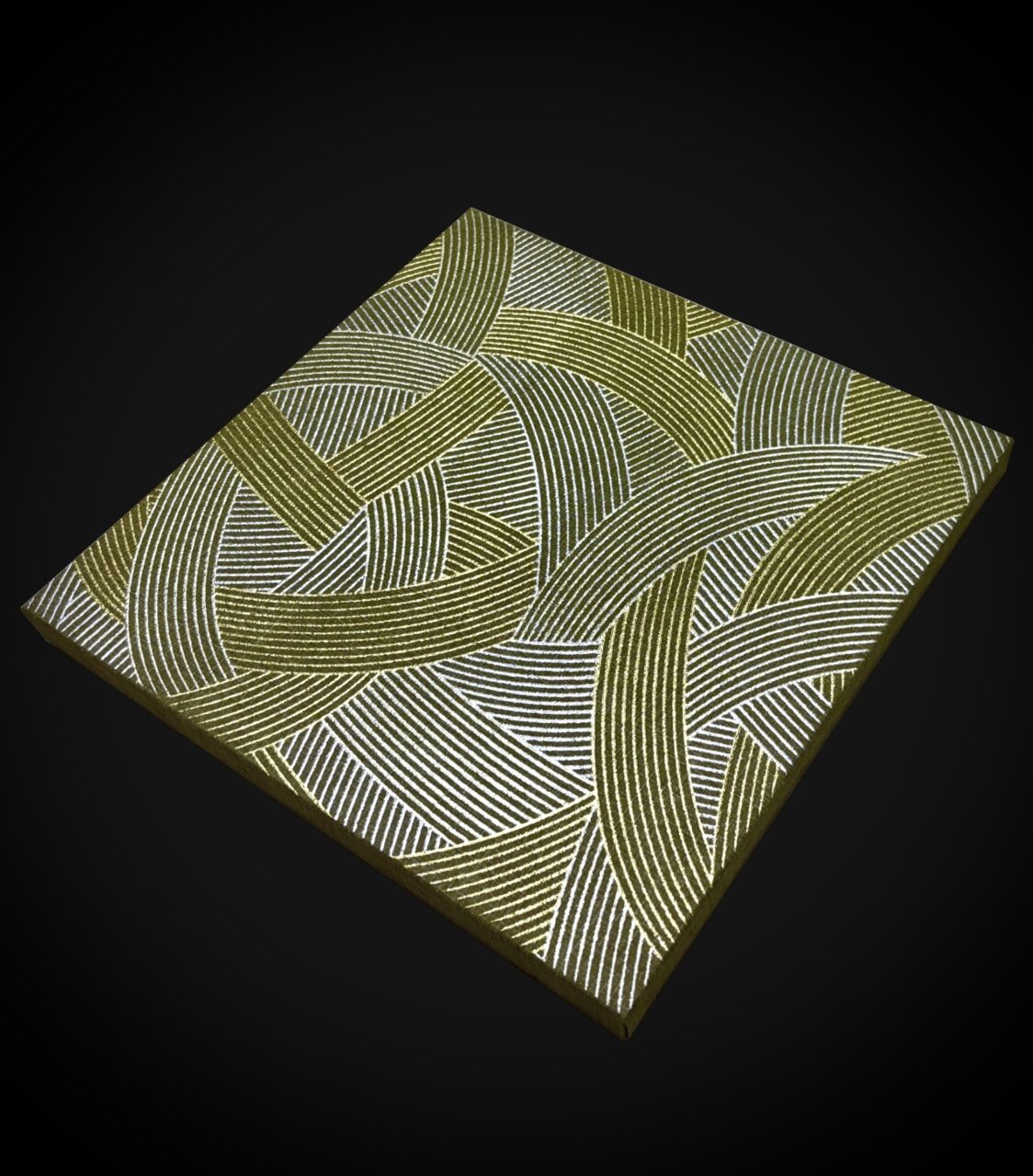 京友禅の金彩工芸技術「摺箔」を用いた300mm角のファブリックパネルです。和の色で染め上げた生地に、繊細な箔の輝きを重ね、上質で落ち着きある空間を演出。宿泊施設の客室やロビーを格調高く彩ります。(生地色複数)